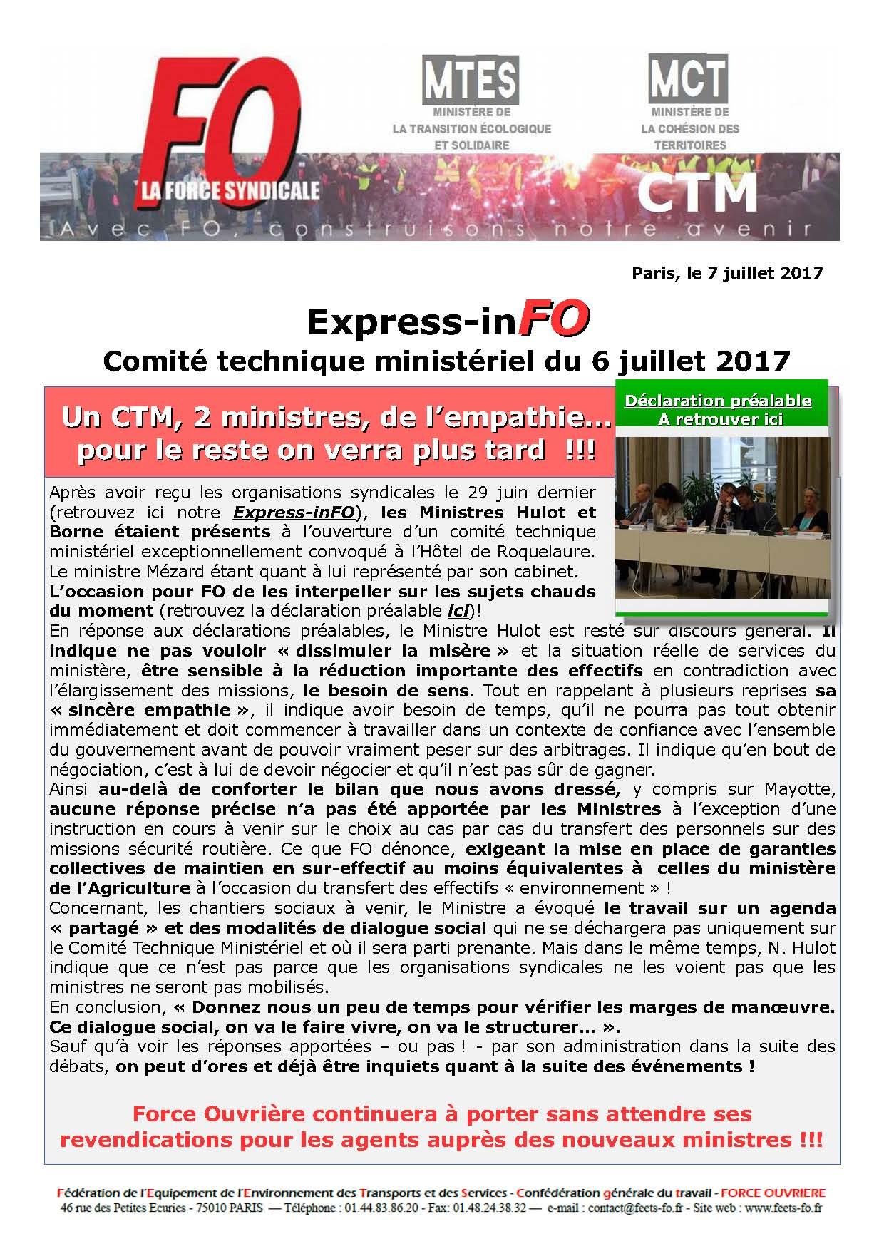 FORCE OUVRIERE exige donc des propositions d’actions dès la rentrée, Nicolas Hulot reconnaissant être conscient que la mise en œuvre de ses politiques ne va pas sans la satisfaction de nos revendications.