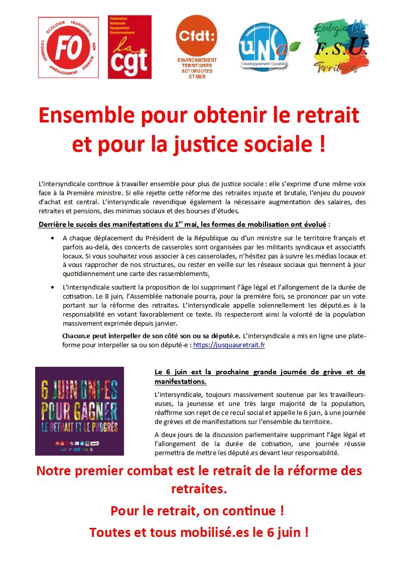 L’intersyndicale appelle les travailleuses et les travailleurs, jeunes et retraité.es à faire du 6 juin une grande journée de grèves et de manifestations sur l’ensemble du territoire pour gagner le retrait de la réforme des retraites et des avancées sociales.