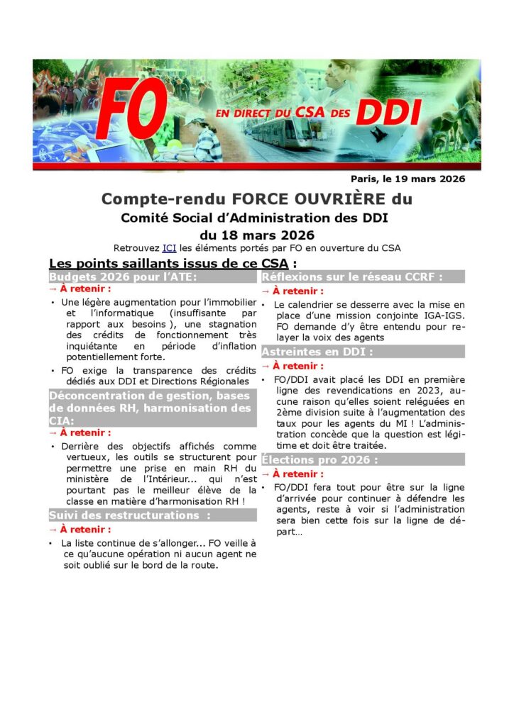 Retrouvez ICI le compte-rendu des débats du Comité Social d’Administration des DDI du 18 mars 2026, ainsi que les éléments portés par FO en ouverture ICI.