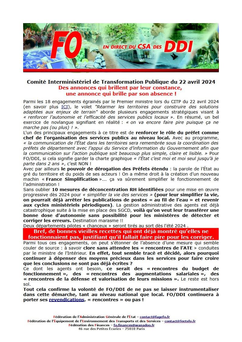 Parmi les 18 engagements égrainés par le Premier ministre lors du Comité Interministériel de Transformation Publique du 22 avril 2024, le volet « Réarmer les territoires pour construire des solutions adaptées aux enjeux de terrain » aborde plusieurs engagements stratégiques visant à « renforcer l’autonomie et l’efficacité des services publics locaux ». En résumé, un bel exercice de novlangue signifiant en réalité : « on va encore faire pire puisque ça ne marche pas (ou plus) ! ».