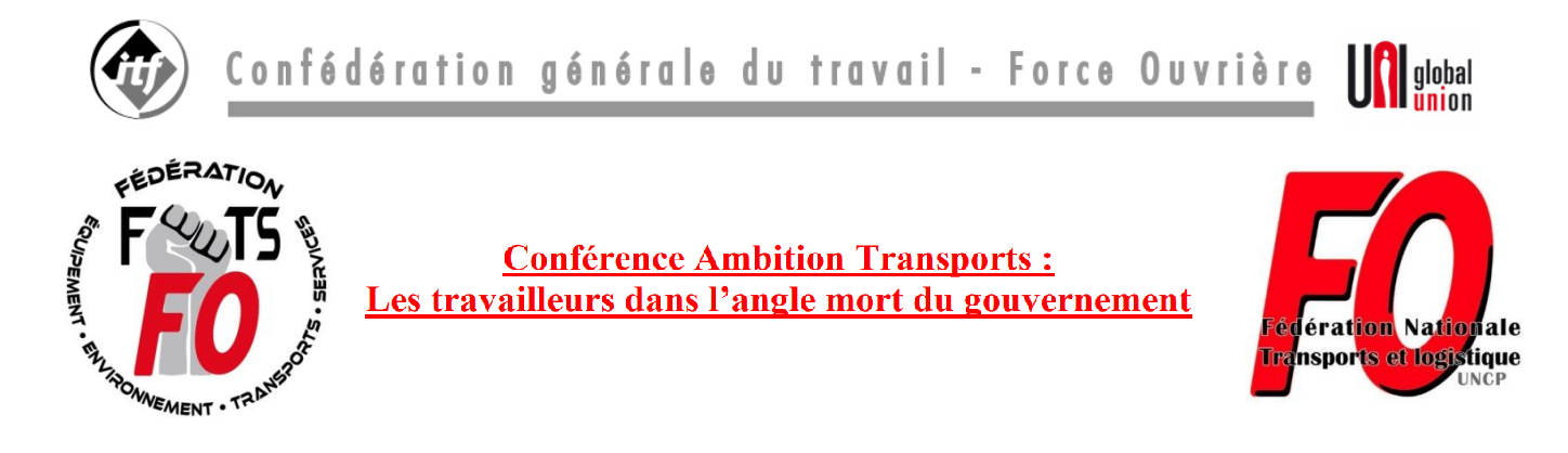 La Fédération de l’Équipement, de l’Environnement, des Transports et des Services Force Ouvrière et la Fédération Nationale des Transports et de la Logistique FO UNCP constatent le lancement de la conférence « Ambition France Transports ».