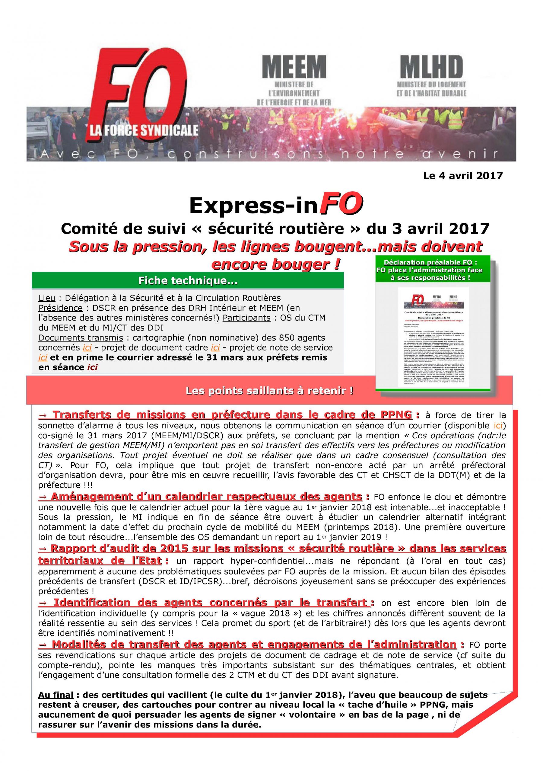 Au niveau local, les opérations initiées ou qui seraient initiées visant à transférer des missions « sécurité routière » en préfecture ont vocation à être contrées en CHSCT et CT sur la base de l’instruction du 31 mars adressée aux Préfets (ci-jointe) !