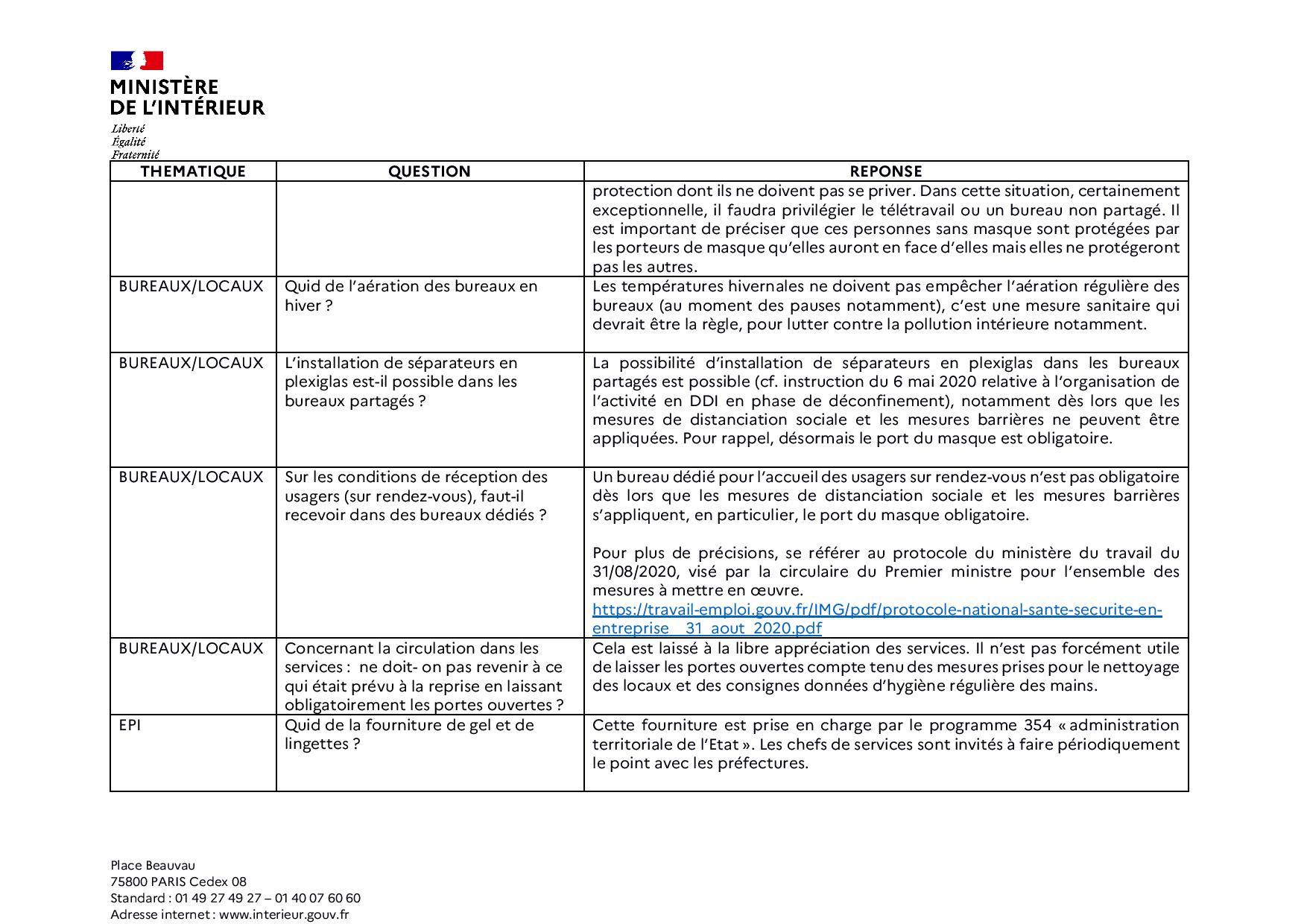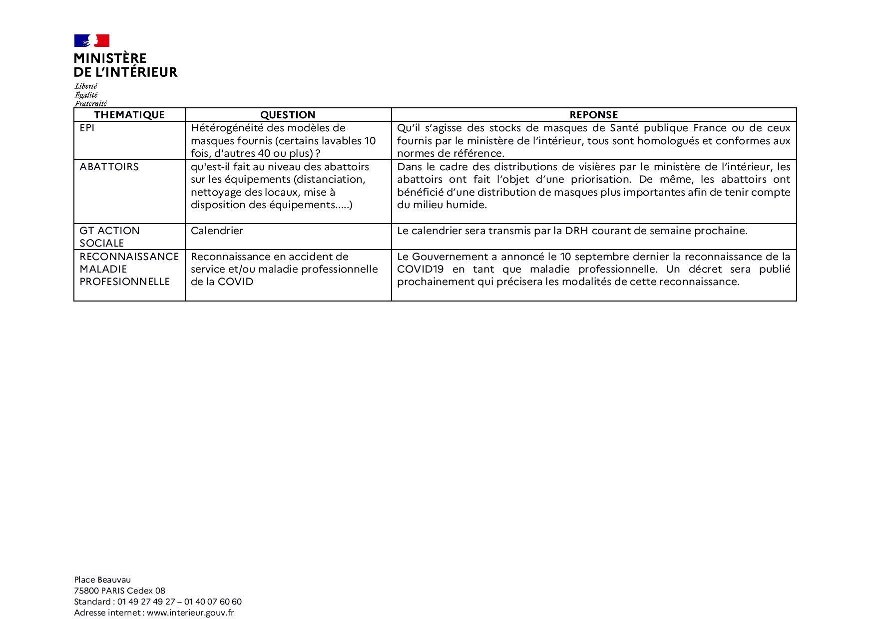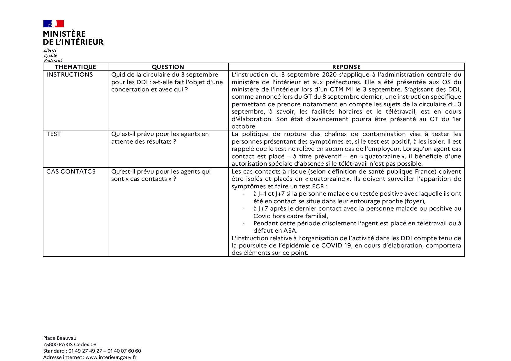 Par ailleurs, le Secrétaire général du ministère de l’Intérieur s’engage à l’élaboration d’une instruction spécifique relative à l’organisation de l’activité des DDI au regard de de la situation sanitaire. L’état de ces travaux sera présenté lors du comité technique des DDI du premier octobre prochain.