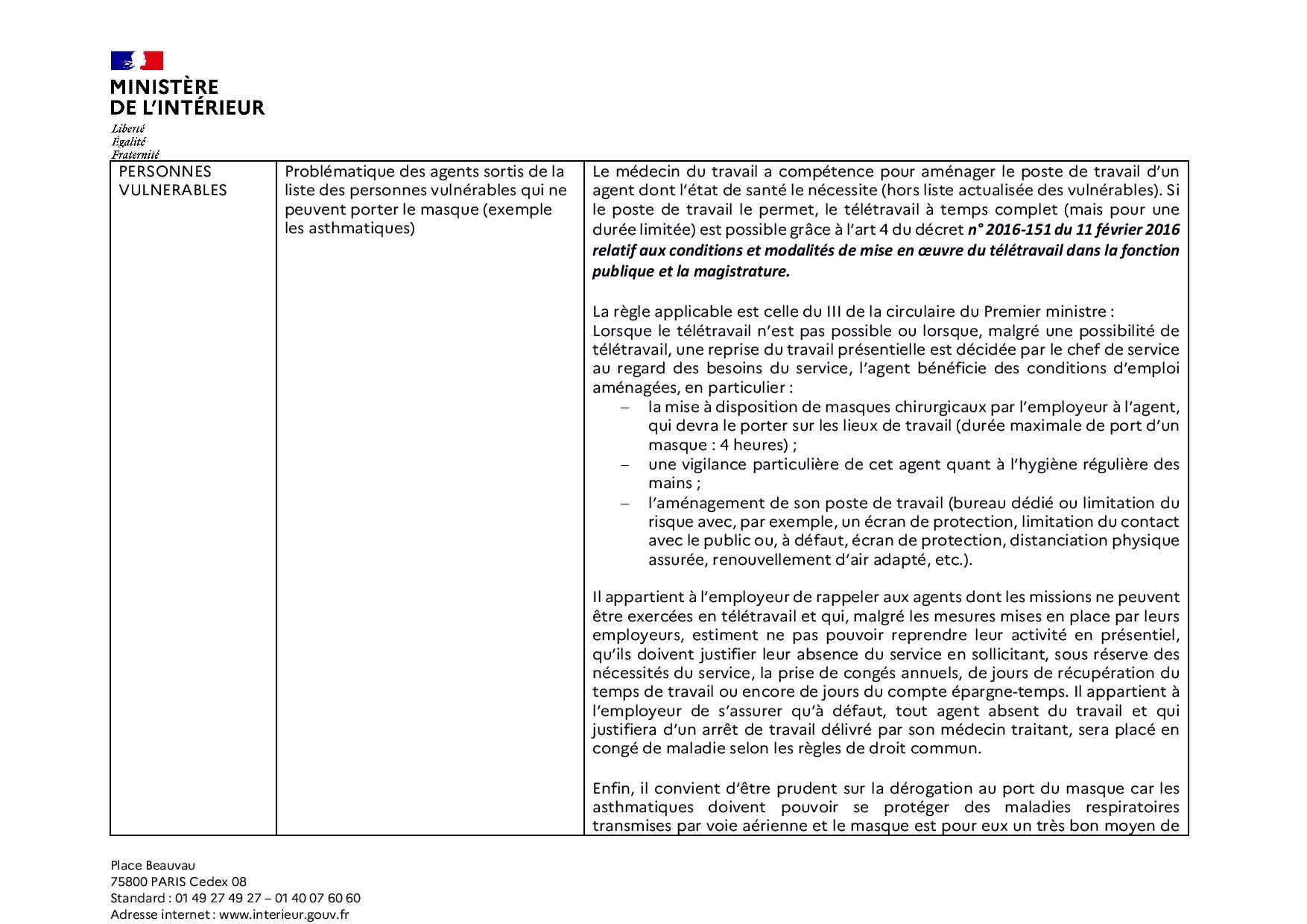 Eu égard à la situation sanitaire, les décisions prises au niveau national peuvent être amenées à évoluer rapidement, ces réponses sont donc celles applicables à cette date. FO continuera à agir à tout les niveaux pour les faire évoluer dans le sens de la protection des agents.
