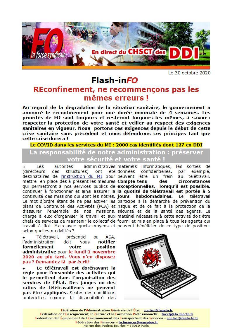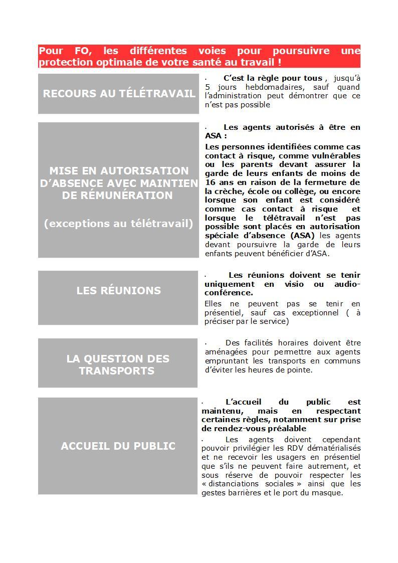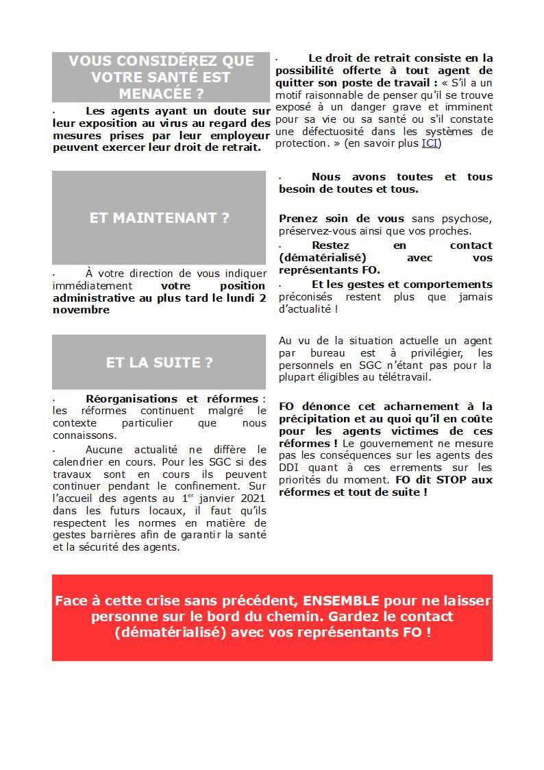 Au regard de la dégradation de la situation sanitaire, le gouvernement a annoncé le reconfinement pour une durée minimale de 4 semaines. Les priorités de FO sont toujours et resteront toujours les mêmes, à savoir : respecter la protection de votre santé et veiller au respect des exigences sanitaires en vigueur. Nous portons ces exigences depuis le début de cette crise sanitaire sans précédent et nous défendrons ces principes tant que cette crise durera !