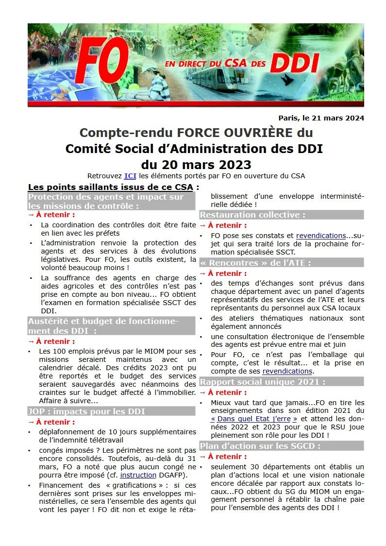 Crise agricole, prépa des JOP, rencontres de l’ATE, SGCD, budgets de fonctionnement: au menu du CSA des DDI Laurent Janvier Le 20 mars 2024 Laurent Janvier Le 20 mars 2024 Retrouvez ci-après le compte-rendu du CSA des DDI du 20 mars 2024. Cliquez ICI