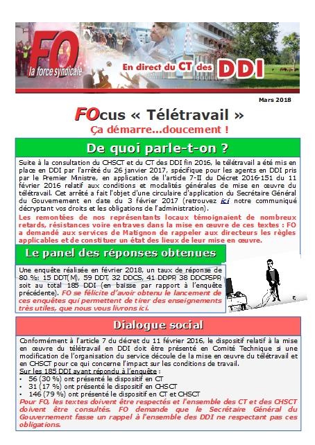 Vous trouverez ci-après le compte-rendu du CT des DDI du 29 mars 2018, ainsi que notre FOcus « Télétravail ».