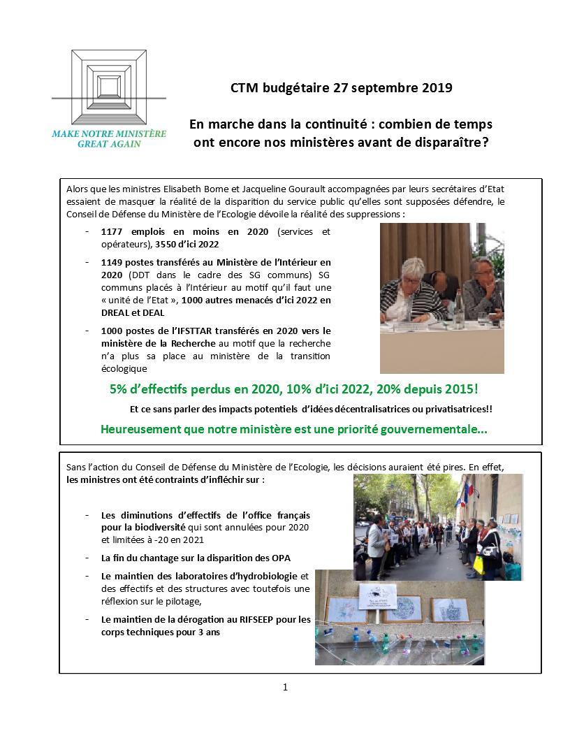 Effectifs supprimés ou transférés, inflexions obtenues (Office Français pour la Biodiversité, laboratoires d’hydrobiologie, OPA, dérogation au RIFSEEP pour les corps techniques) et engagements sur lesquels nous ne lâcherons rien, retrouvez ICI le communiqué du Conseil de Défense du Ministère de l’Ecologie à l’issue du CTM budgétaire du 27 septembre 2019.