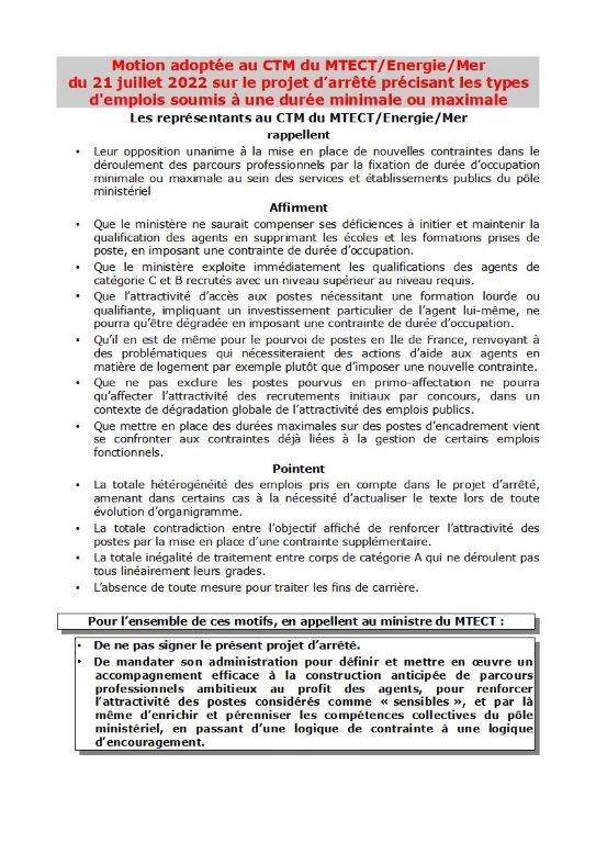 Retrouvez ICI le compte rendu du CTM du 21 juillet 2022 au sujet des durées minimales et maximales dans certains postes.