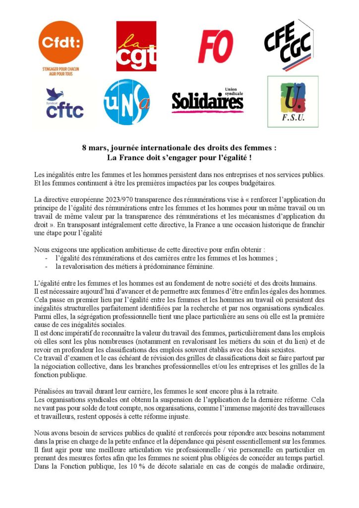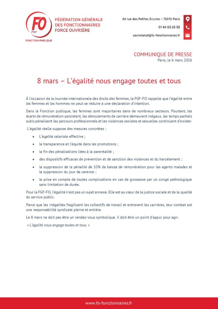 Egalité pro: les mots pour réduire les maux! Laurent Janvier Le 6 mars 2026 Laurent Janvier Le 6 mars 2026 Revendications : Pour des parcours professionnels dans une Fonction Publique attractive, valorisée et fière de sa diversité