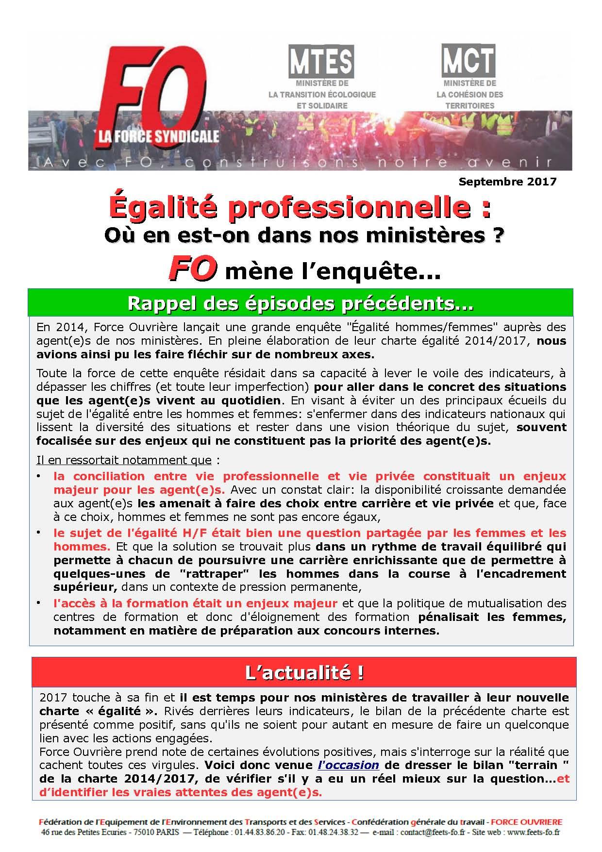 En 2014, Force Ouvrière lançait une grande enquête « Égalité hommes/femmes » auprès des agent(e)s de nos ministères. En pleine élaboration de leur charte « égalité » 2014/2017, nous avions ainsi pu les faire fléchir sur de nombreux axes.