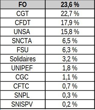 Pour les CSA de la DGAC, FO est No1 au SCR (SG, DTA), ENAC, DNUM, SNIA, STAC et SEAC/PF. FO est  No2 à la DSAC et au BEA.