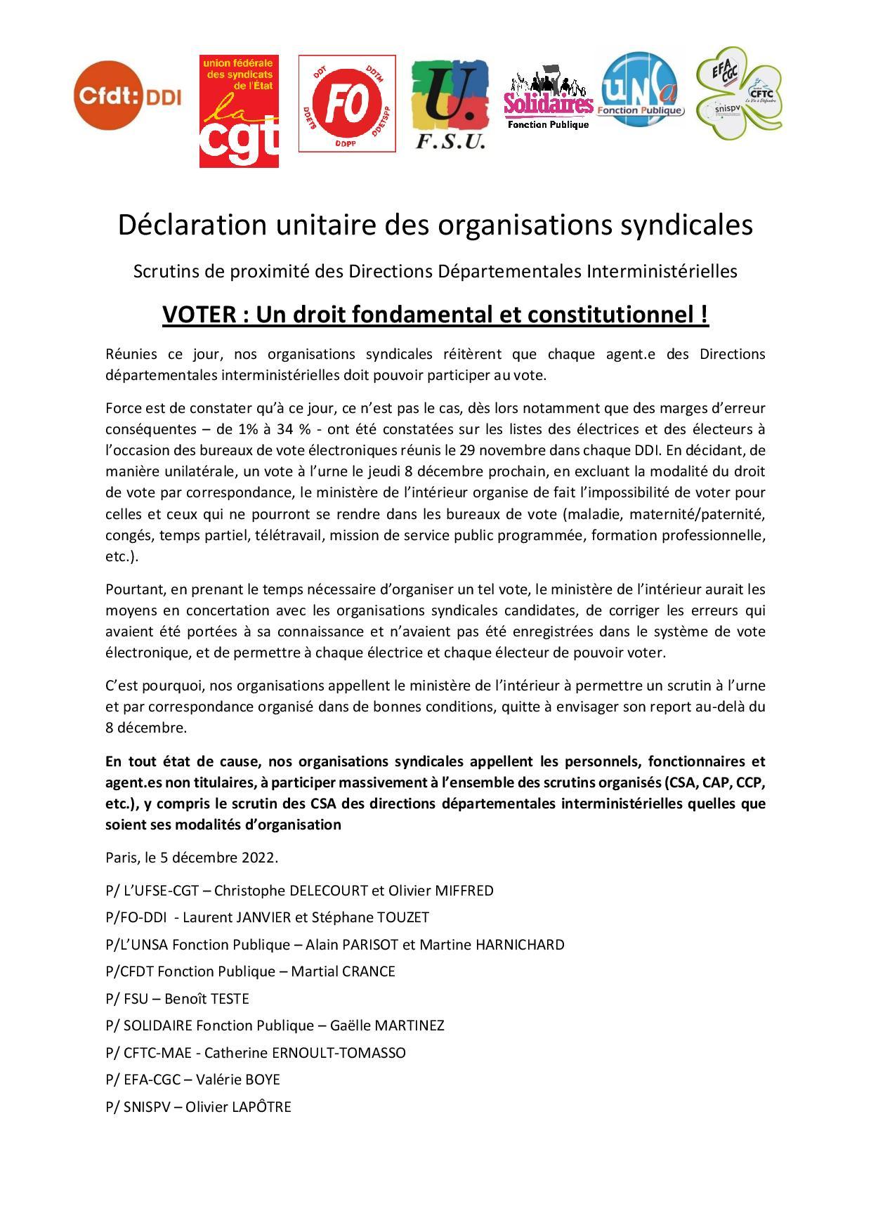 Face à cette situation inédite, l’administration au plus haut niveau (le ministre de la Fonction Publique) a décidé unilatéralement que le vote pour les CSA des DDI se tiendrait finalement à l’urne « physique » le 8 décembre.