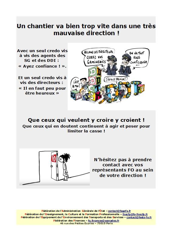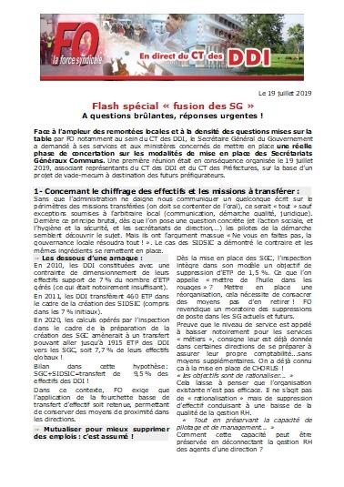 Face à l’ampleur des remontées locales et à la densité des questions mises sur la table par FO notamment au sein du CT des DDI, le Secrétaire Général du Gouvernement a demandé à ses services et aux ministères concernés de mettre en place une réelle phase de concertation sur les modalités de mise en place des Secrétariats Généraux Communs. Une première réunion était en conséquence organisée le 19 juillet 2019, associant représentants du CT des DDI et du CT des Préfectures, sur la base d’un projet de vade-mecum à destination des futurs préfigurateurs.