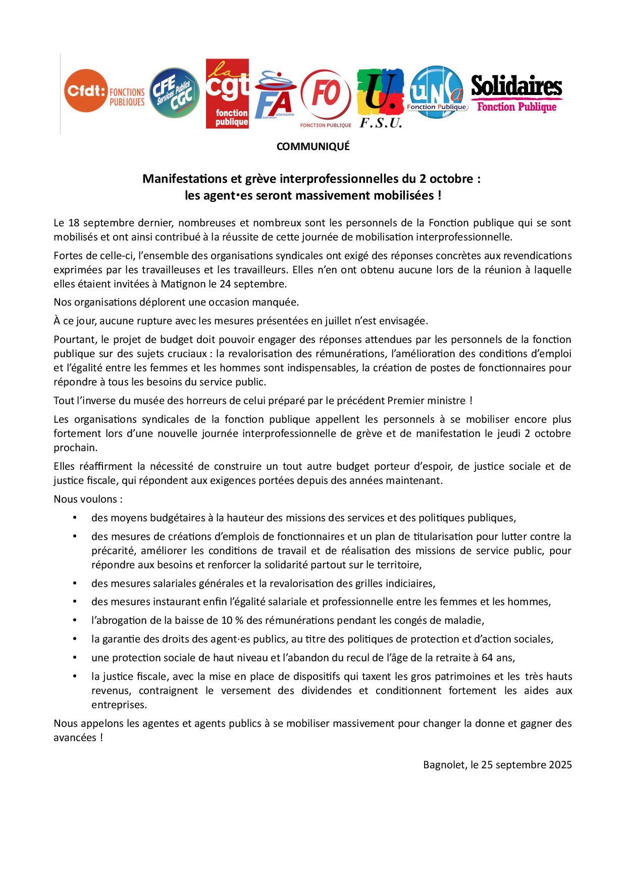 Grève et manifestations interprofessionnelles du 2 octobre – Mobilisation de la Fonction publique