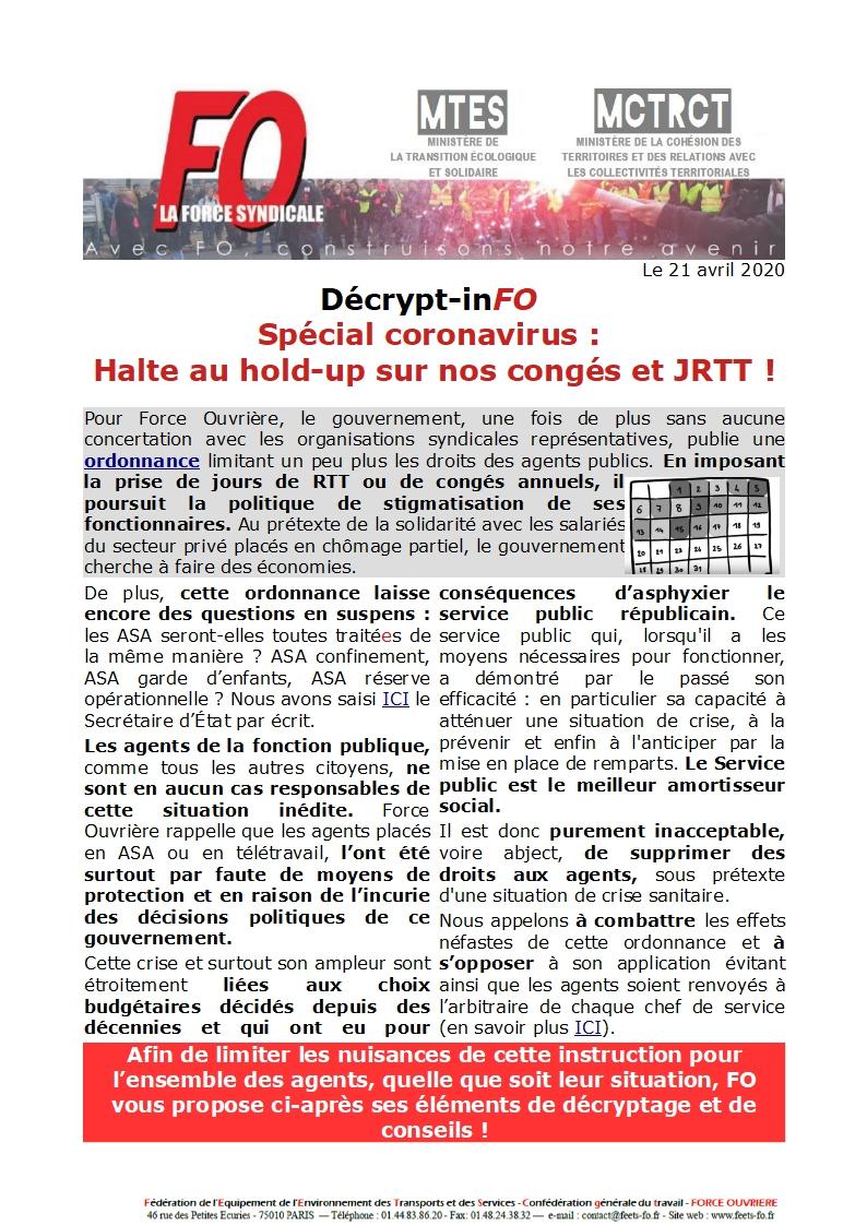 FO refuse d’entrer dans ce jeu et combat à tous les niveaux l’application de l’ordonnance du 15 avril 2020 et exige des instructions ministérielles allant dans le sens de la préservation de vos droits.
