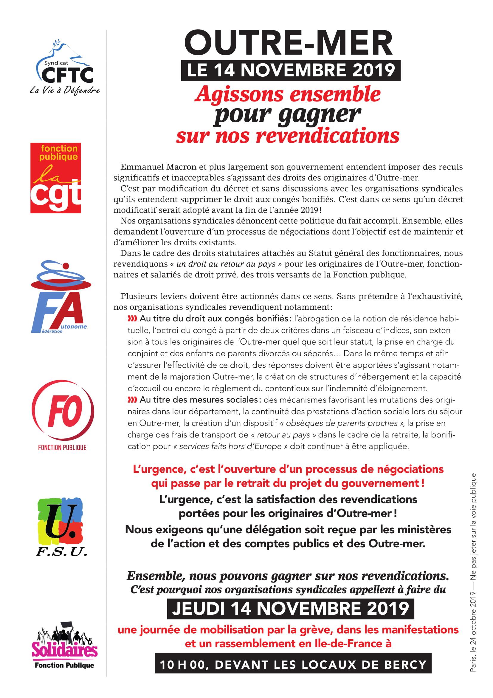 Retrouvez ICI le communiqué « Rassemblement des ultramarins à Bercy pour préserver leurs droits à congés bonifiés » ainsi que ICI le compte-rendu de la réunion du 7 novembre à la DGAFP sur la réforme des congés bonifiés, et ICI le préavis de grève déposé par l’UIAFP-FO pour le 14 novembre 2019.