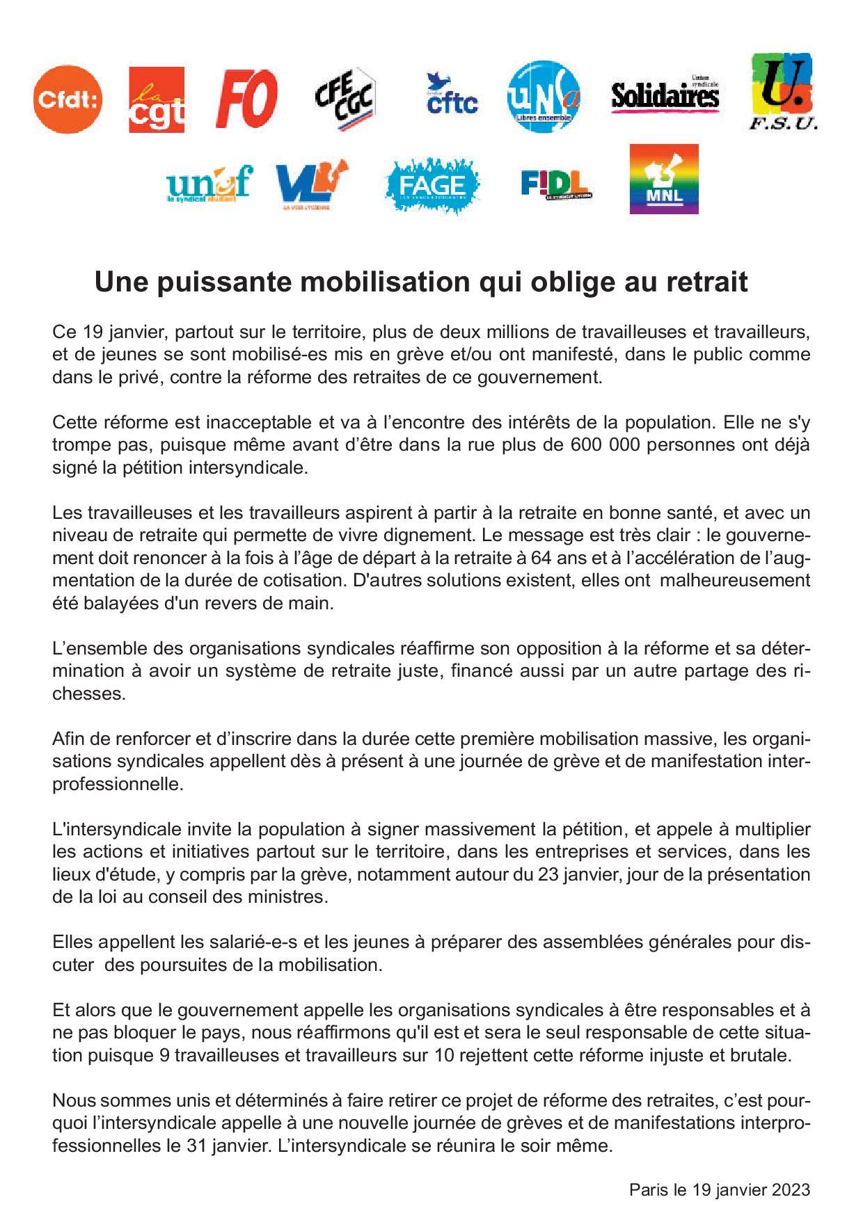 Le gouvernement ne s’attendait pas à un tel « 19 janvier »…rendez-vous le 31 janvier pour enfoncer le clou de la résistance Laurent Janvier Le 20 janvier 2023 Laurent Janvier Le 20 janvier 2023