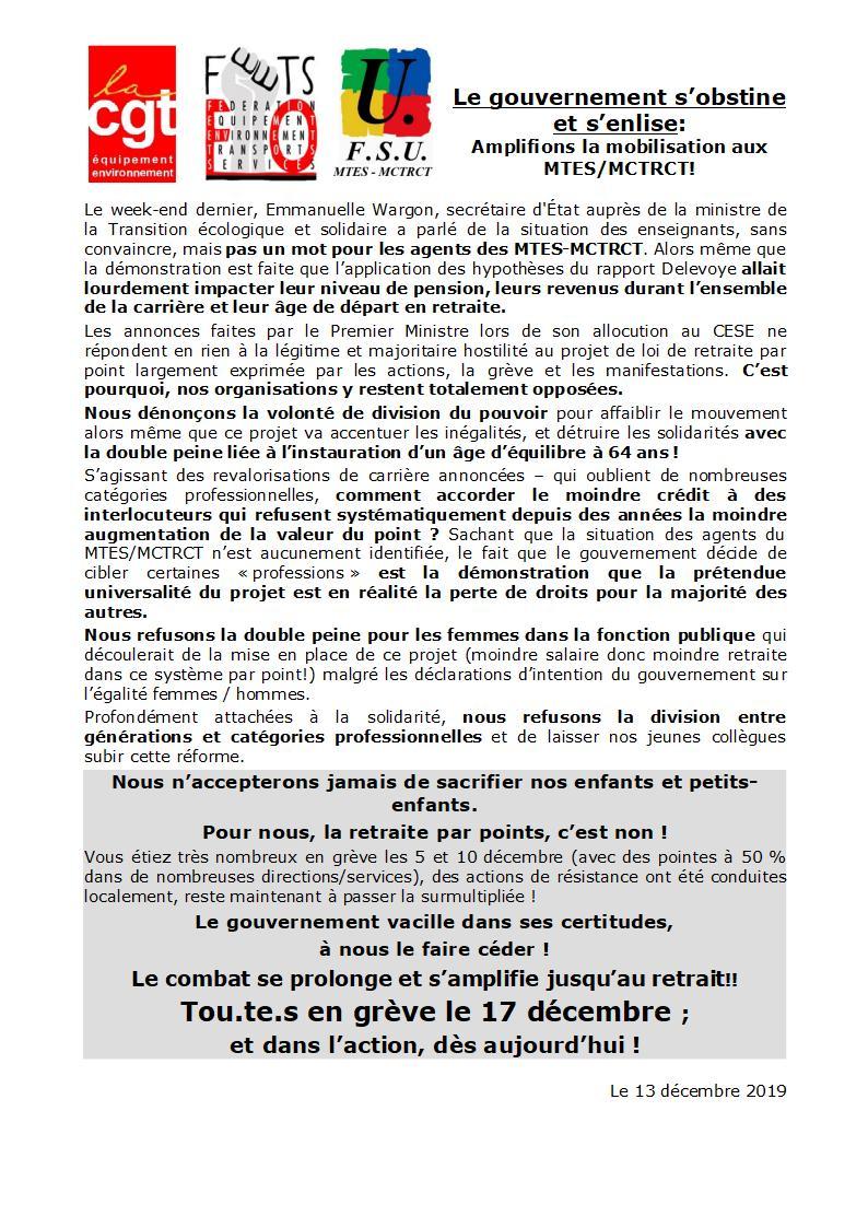 Le gouvernement s’obstine et s’enlise: amplifions la mobilisation aux MTES/MCTRCT Laurent Janvier Le 13 décembre 2019 Laurent Janvier Le 13 décembre 2019 Cliquez ICI