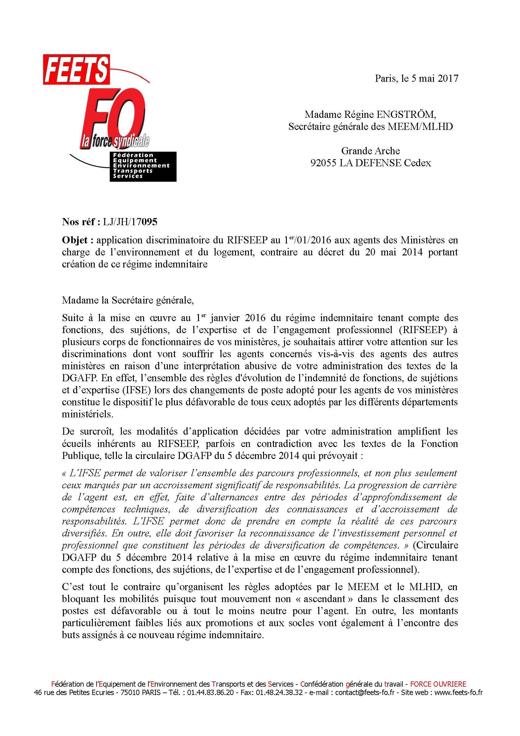 Face au constat que les modalités adoptées par le MEEM pour mettre en oeuvre le RIFSEEP constituent le dispositif le plus défavorable de tous ceux adoptés par les différents départements ministériels, la FEETS-FO a saisi la SG du MEEM, lui demandant de mobiliser ses services dans les meilleurs délais pour :