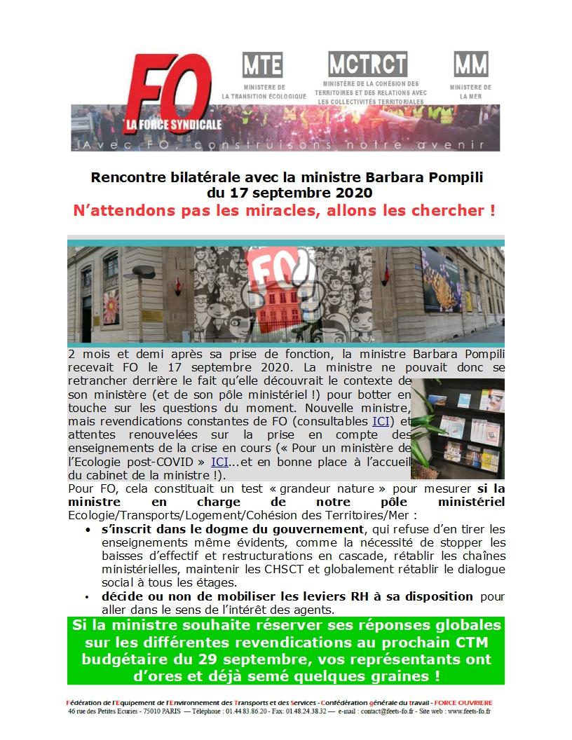 2 mois et demi après sa prise de fonction, la ministre Barbara Pompili recevait FO le 17 septembre 2020.