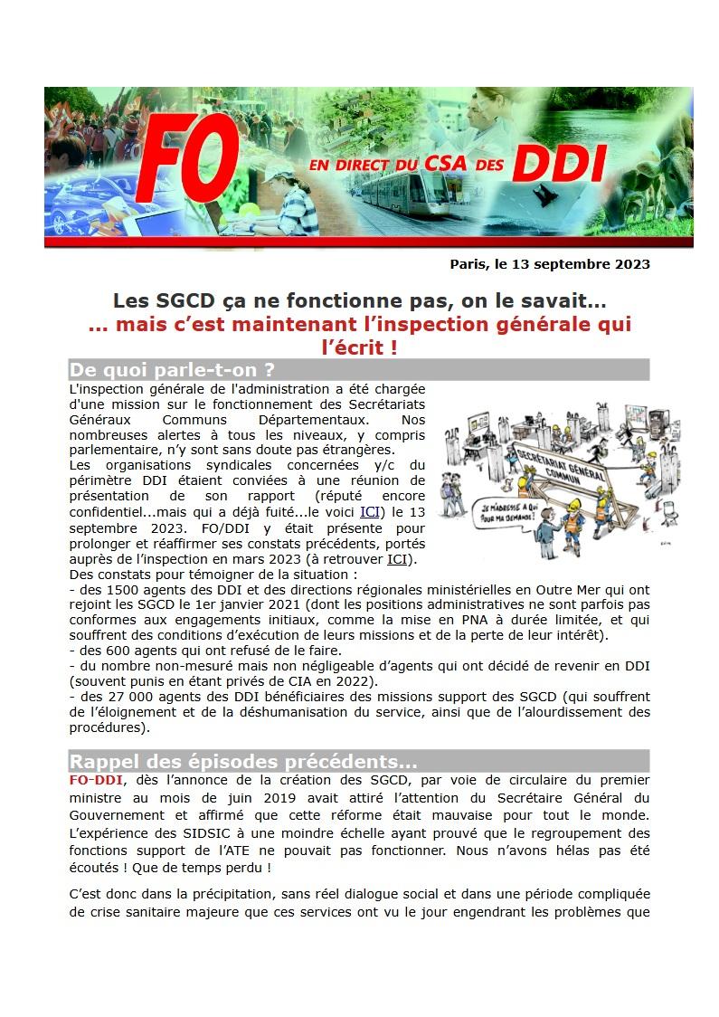 Les organisations syndicales concernées y/c du périmètre DDI étaient conviées à une réunion de présentation de son rapport (réputé encore confidentiel…mais qui a déjà fuité…le voici ICI) le 13 septembre 2023. FO/DDI y était présente pour prolonger et réaffirmer ses constats précédents, portés auprès de l’inspection en mars 2023 (à retrouver ICI).