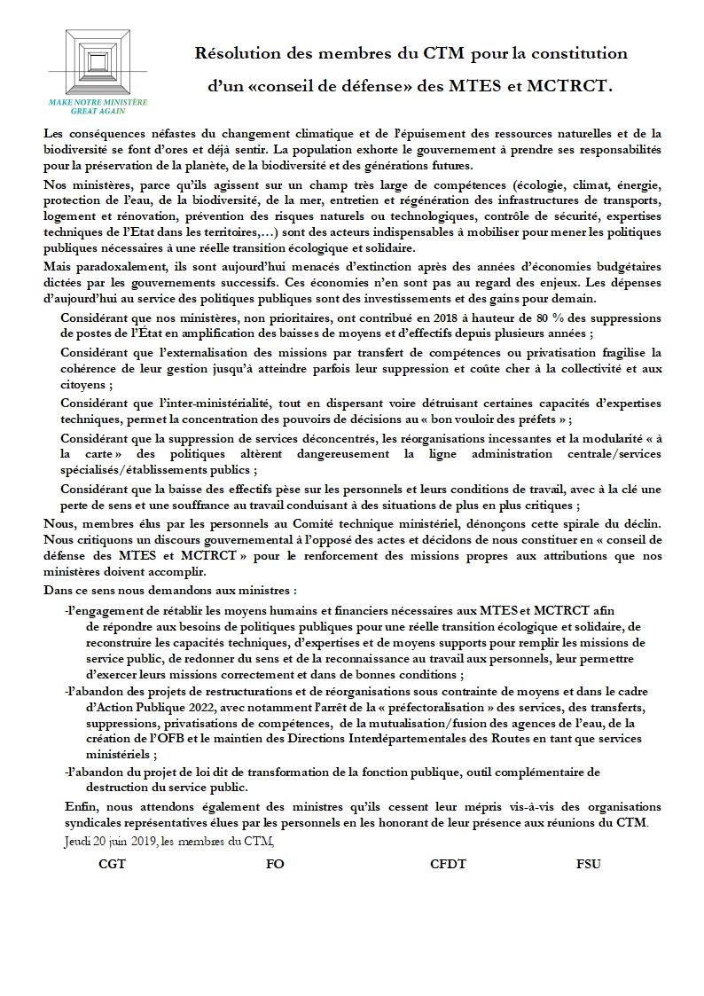 Les organisations syndicales majoritaires CGT – FO – CFDT – FSU ont décidé le 20 juin 2019 de la création d’un conseil de défense du ministère de l’écologie. Ce conseil rappellera chaque fois que nécessaire la réalité des moyens engagés au regard des ambitions des discours !