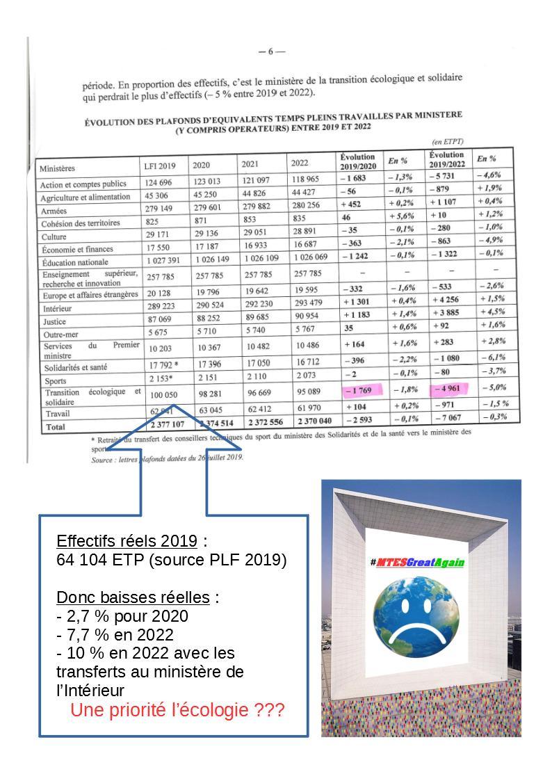Pire, lorsque l’on gomme les mensonges du gouvernement sur le nombre réel d’agents présents, et que l’on intègre les transferts programmés vers le ministère de l’Intérieur, ce sont 10% des effectifs du ministère de l’Ecologie qui sont menacés d’ici 2022!
