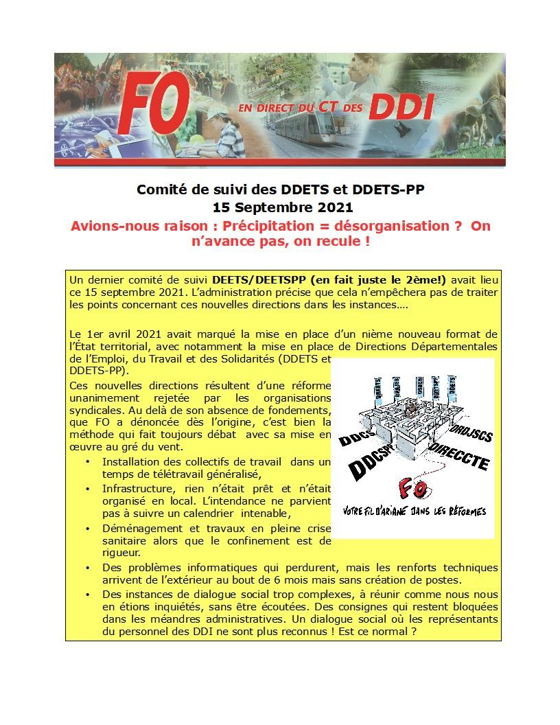 nformatique, effectifs, gestion RH, immobilier, élections: autant de sujets au menu du comité de suivi DDETS/DDETSPP du 15 septembre 2021. Alors les DEETS et DEETSPP existent-elles ? Sur le papier et dans les bureaux parisiens certainement, sur le terrain, au vu des remontées, on en est loin, c’est la désorganisation totale et pourtant le PSATE (Projet stratégique de l’état territorial) 2022 – 2025 est censé simplifier la vie et la gestion des agents. Pour l’instant, c’est bien le contraire qui se produit avec des « ordres » qui viennent de partout et de nulle part.