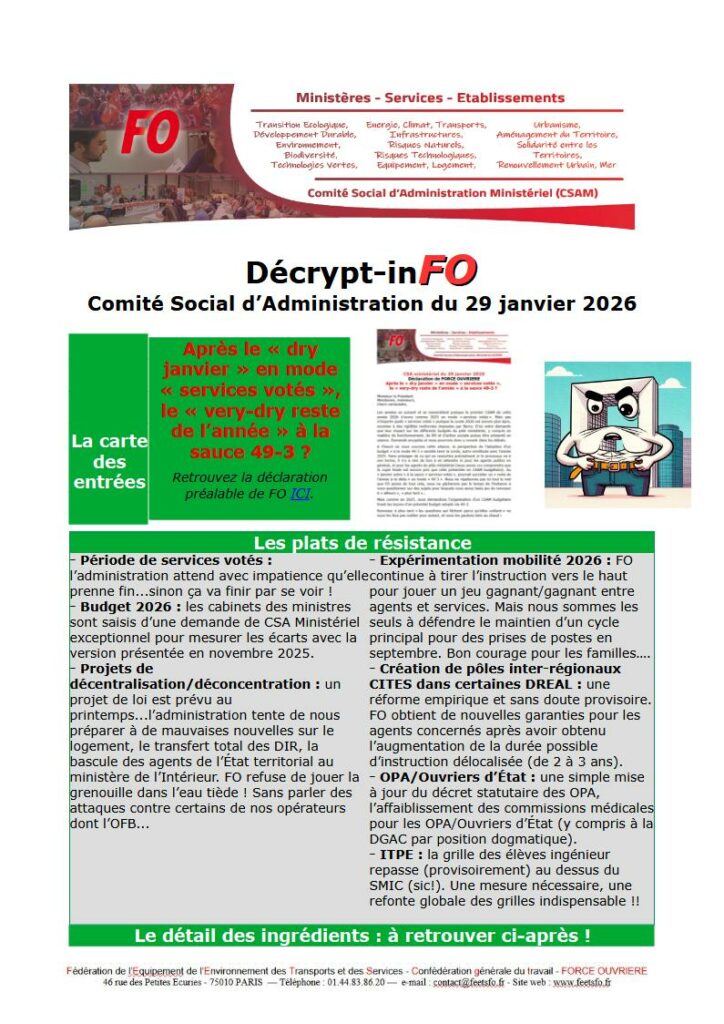 • Budget 2026 : services votés prolongés mais a priori bientôt terminés, visibilité minimale, demande FO d’un CSAM exceptionnel pour mesurer les effets de la loi de Finances prochainement promulguée.