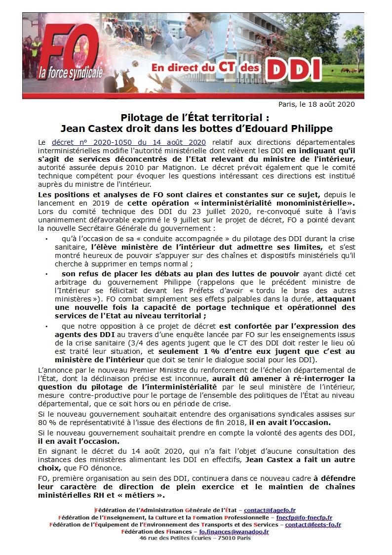 En signant le décret du 14 août 2020, qui n’a fait l’objet d’aucune consultation des instances des ministères alimentant les DDI en effectifs, Jean Castex a fait un autre choix, que FO dénonce.