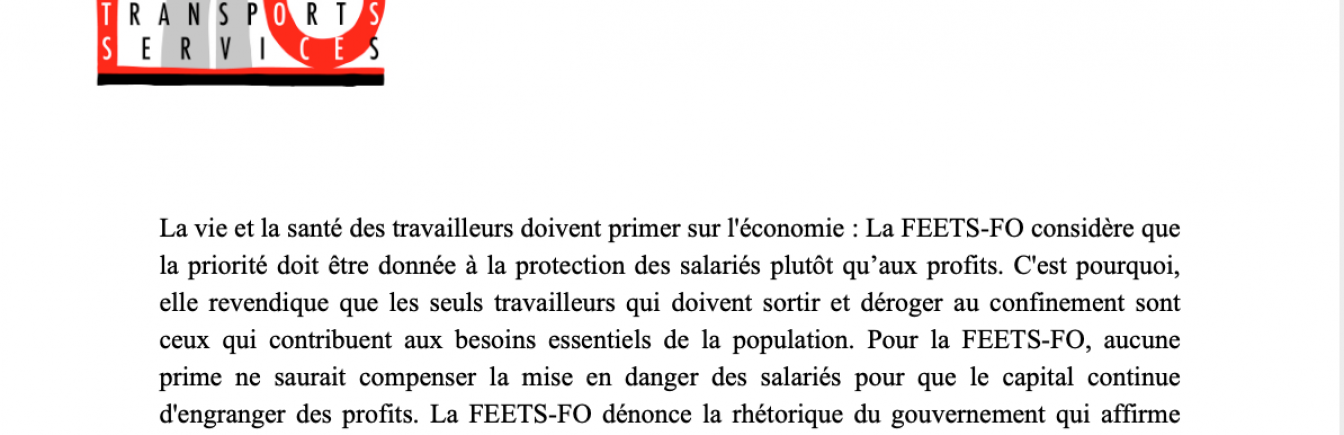 La vie et la santé des travailleurs doivent primer sur l’économie : La FEETS-FO considère que la priorité doit être donnée à la protection des salariés plutôt qu’aux profits. C’est pourquoi, elle revendique que les seuls travailleurs qui doivent sortir et déroger au confinement sont ceux qui contribuent aux besoins essentiels de la population. Pour la FEETS-FO, aucune prime ne saurait compenser la mise en danger des salariés pour que le capital continue d’engranger des profits. La FEETS-FO dénonce la rhétorique du gouvernement qui affirme qu’il est impossible de savoir quels secteurs sont indispensables ou non. Les travailleurs eux savent parfaitement ce qui est indispensable dans ce qu’ils font pour la population.