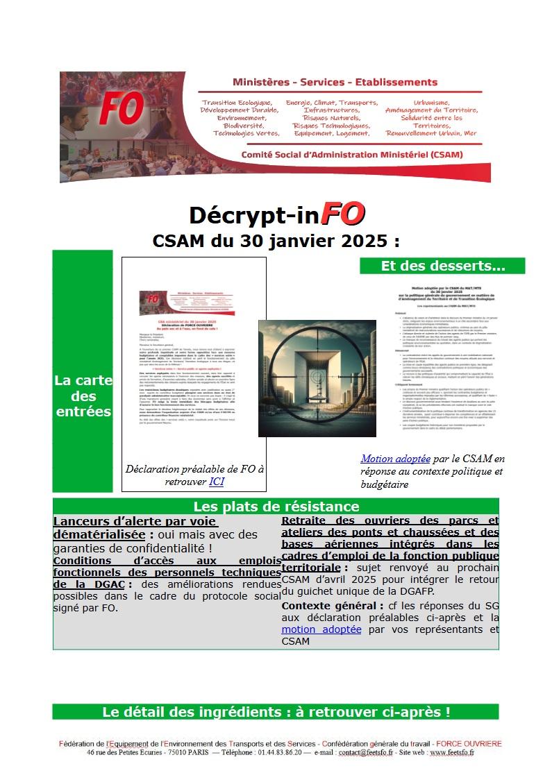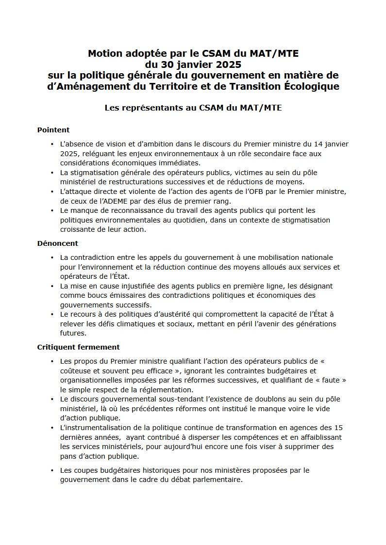 Retrouvez ci-après le compte-rendu des débats du Comité Social d’Administration Ministériel du 30 janvier 2025. Avec à la clé au delà des sujets inscrits à l’ordre du jour l’adoption d’une motion sur la politique générale du gouvernement en matière de d’Aménagement du Territoire et de Transition Écologique, transmise en cours de séance aux cabinets des ministres.