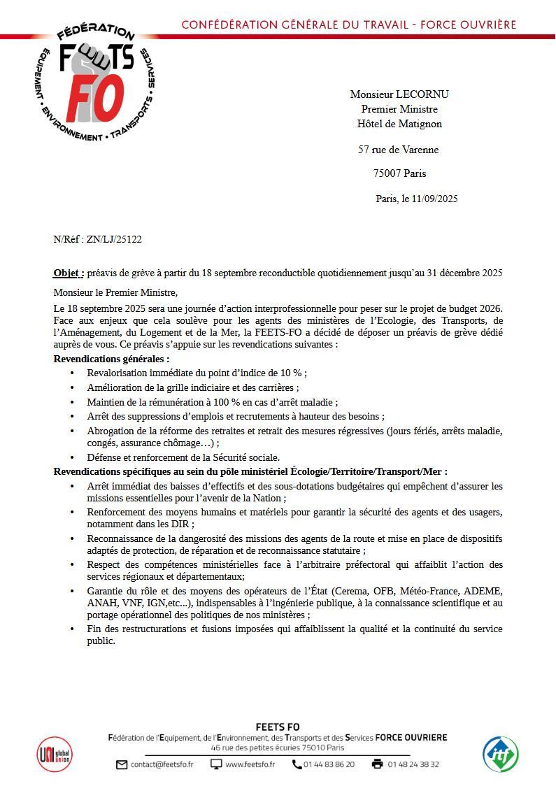 La FEETS-FO a déposé auprès du Premier minustre un préavis de grève du 18 septembre au 31 décembre 2025.