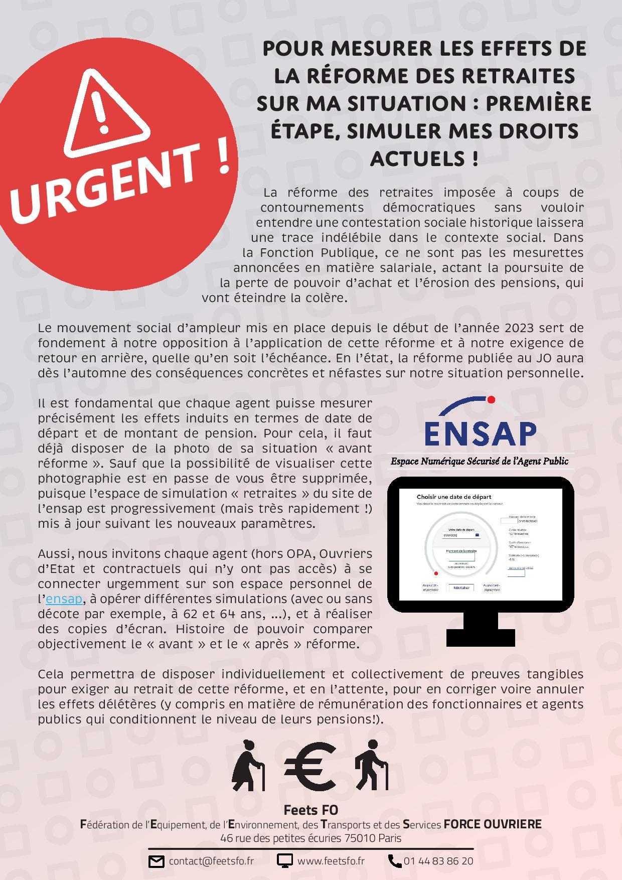 Aussi, nous invitons chaque agent à se connecter urgemment sur son espace personnel de l’ensap, à opérer différentes simulations (avec ou sans décote par exemple, à 62 et 64 ans, …), et à réaliser des copies d’écran. Histoire de pouvoir comparer objectivement le « avant » et le « après » réforme…et disposer des éléments concrets pour exiger son abrogation!