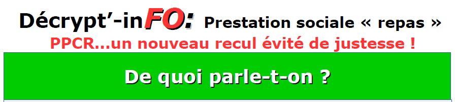 FO n’a cessé de dénoncer les effets néfastes de PPCR (protocole « parcours professionnels, carrière et rémunérations ») sur de nombreux éléments de la carrière des agents, mais aussi sur des effets de seuil pouvant intervenir dans le cadre de certaines prestations telle que la prestation repas. Certains agents se trouvant exclus de son bénéfice suite à reclassement dans les nouvelles grilles…sans pour autant gagner plus, loin s’en faut !