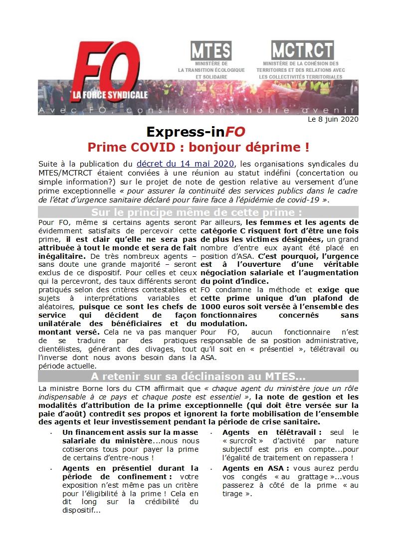 Suite à la publication du décret du 14 mai 2020, les organisations syndicales du MTES/MCTRCT étaient conviées à une réunion au statut indéfini (concertation ou simple information?) sur le projet de note de gestion relative au versement d’une prime exceptionnelle « pour assurer la continuité des services publics dans le cadre de l’état d’urgence sanitaire déclaré pour faire face à l’épidémie de covid-19 ».