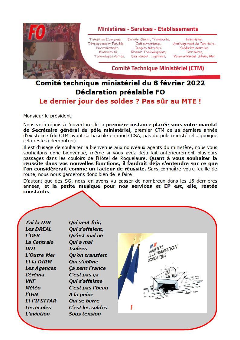 8 février la fin des soldes? Pas sûr au MTE…. Communiqué 8 février 2022 Malvina Caubère Retrouvez ICI la déclaration préalable de FO portée en ouverture du Comité Technique Ministériel du 8 février en présence du nouveau SG du MTE. Cliquez ICI