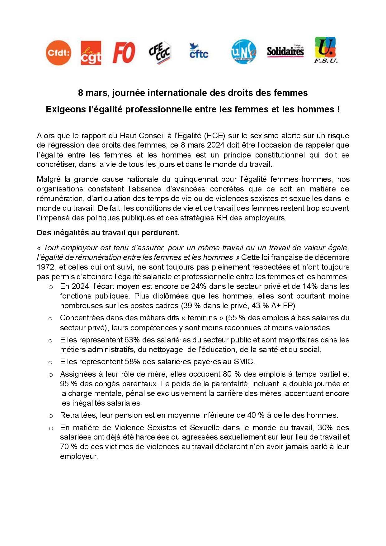 8 mars, journée internationale des droits des femmes Exigeons l’égalité professionnelle entre les femmes et les hommes !