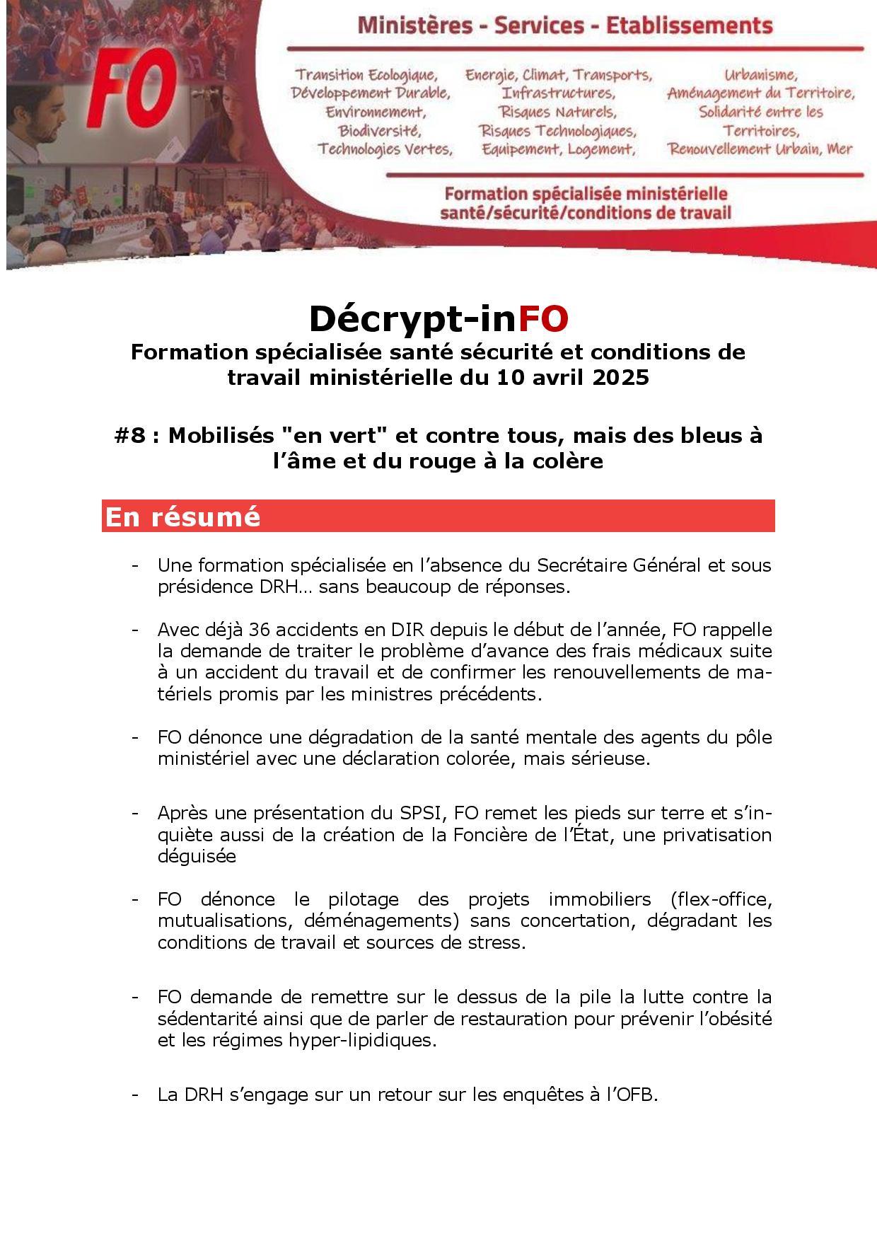 Retrouvez ci-dessous le décrypt-inFO issu des débats de la Formation Spécialisée Santé Sécurité et Conditions de Travail du 10 avril 2025, ainsi que notre déclaration préalable « Mobilisés en VERT et contre tout, mais des BLEUS à l’âme et du ROUGE à la colère ».
