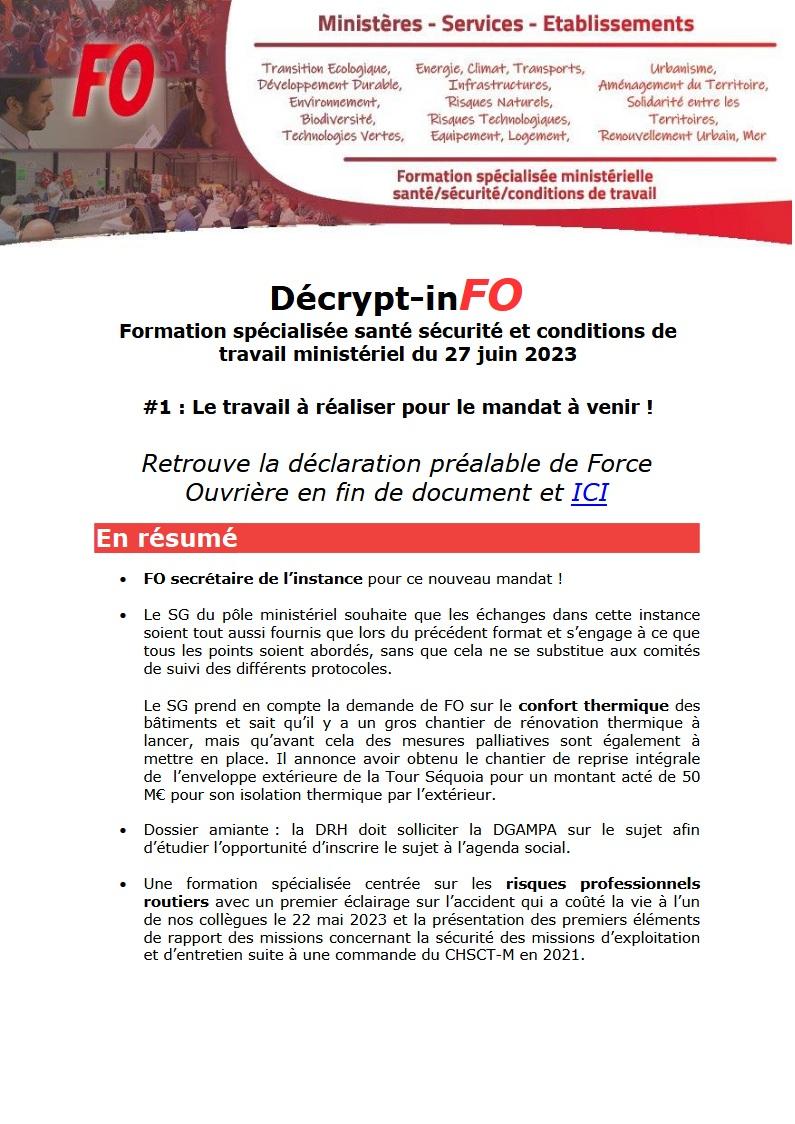 Retrouvez ci-après le décrypt-inFO issu des débats de la première réunion de la Formation Spécialisée Santé Sécurité et Conditions de Travail Ministérielle du 27 juin 2023.