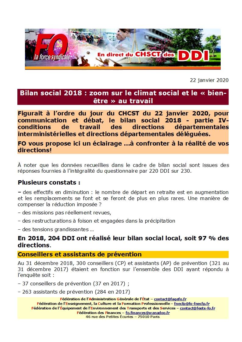 Figurait à l’ordre du jour du CHCST du 22 janvier 2020, pour communication et débat, le bilan social 2018 – partie IV-conditions de travail des directions départementales interministérielles et directions départementales déléguées.