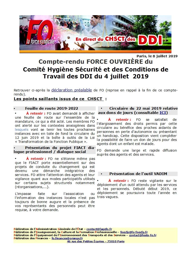 CHSCT des DDI du 4 juillet 2019: feuille de route 2019-2022, dons de jours de repos… CR Réunion 8 juillet 2019 Malvina Caubère Retrouvez ICI le compte-rendu de FO issu de la réunion du CHSCT des DDI du 4 juillet 2019. Cliquez ICI Documents liés SFM_1902-CR-FO-du-CHSCT_DDI_-04_07_2019-VF PDF — 407 Ko DL_CHSCT_04_07_V2 PDF — 332 Ko