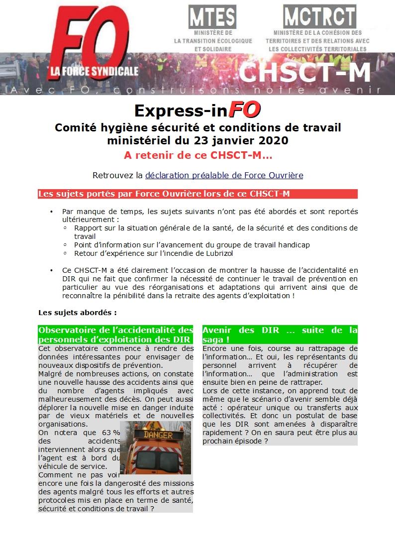 CHSCTM du 23 janvier 2020: les DIR au programme! CR Réunion 27 janvier 2020 Malvina Caubère Retrouvez ICI l’Express’inFO issu des débats du CHSCTM du 23 janvier 2020. Cliquez ICI