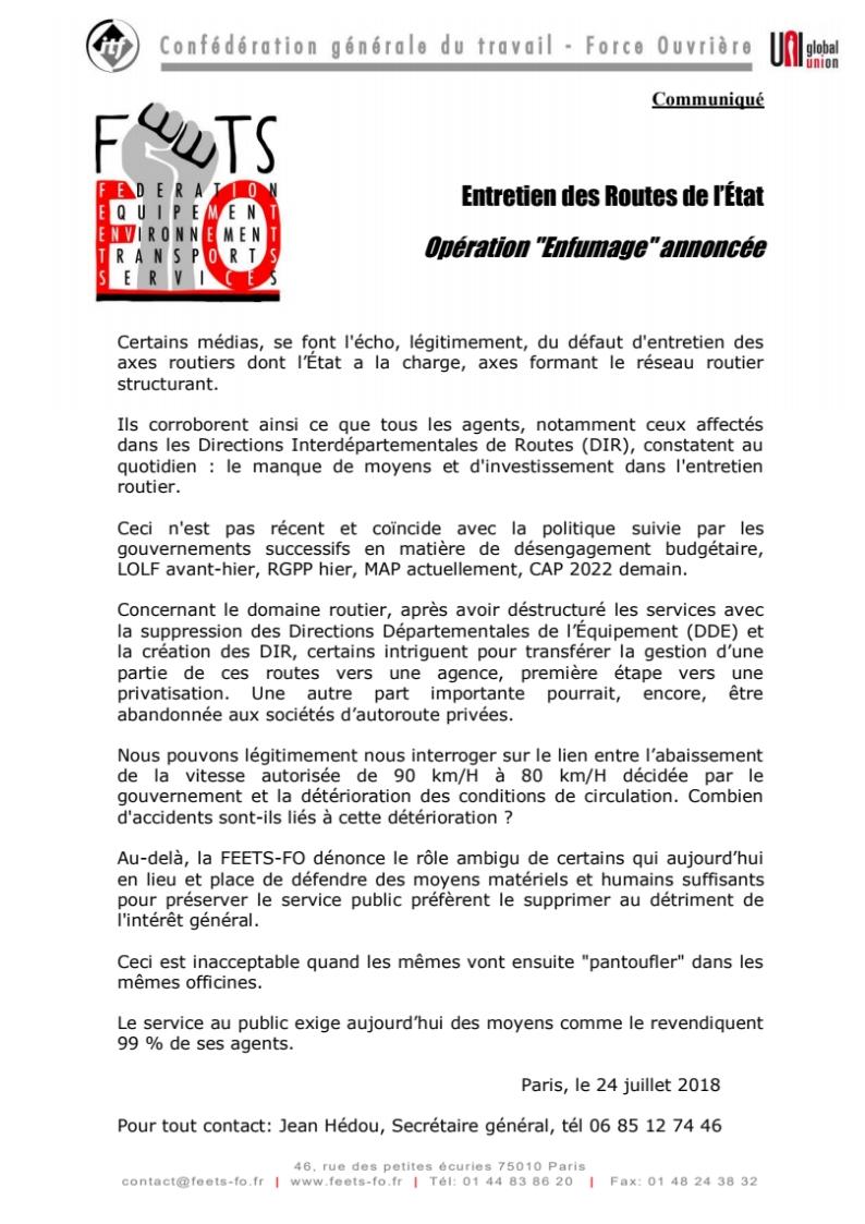 Communique -Entretien des routes de l Etat – operation « Enfumage » annoncée