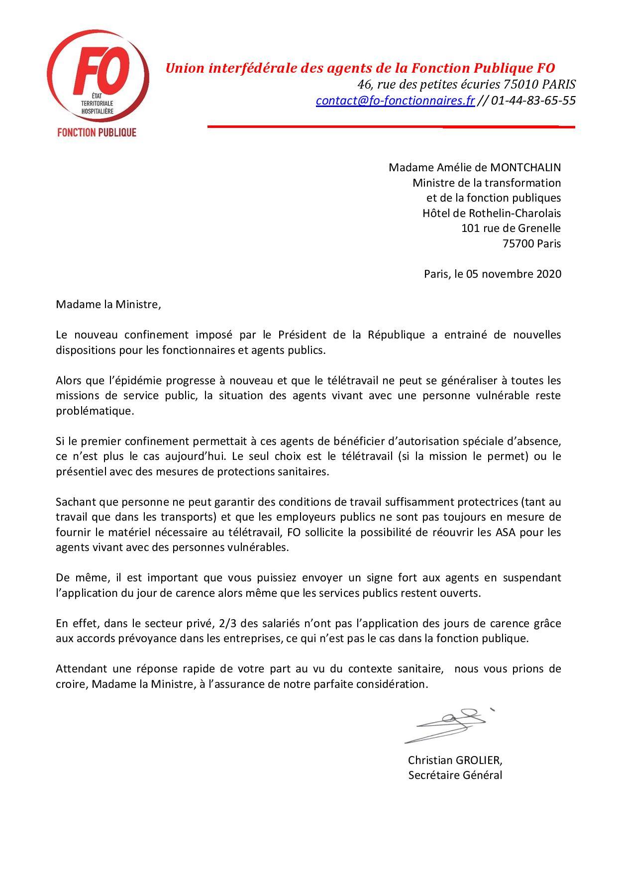 Confinement épisode 2: FO demande le rétablissement des ASA pour les conjoints de personnes vulnérables et la suspension du jour de carence Communiqué 5 novembre 2020 Malvina Caubère
