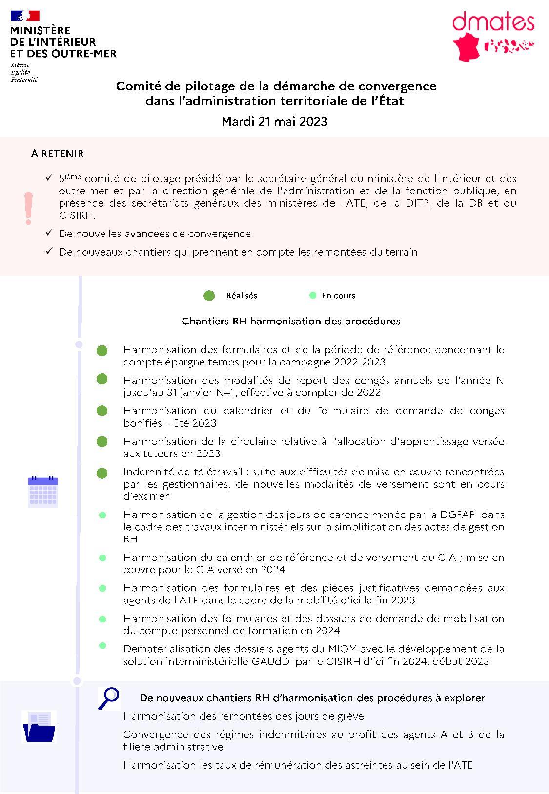 Vous trouverez ci-après le point de situation du COPIL ATE s’étant tenu le 23 mai dernier concernant les mesures de convergence des processus RH pour l’administration territoriale de l’Etat.