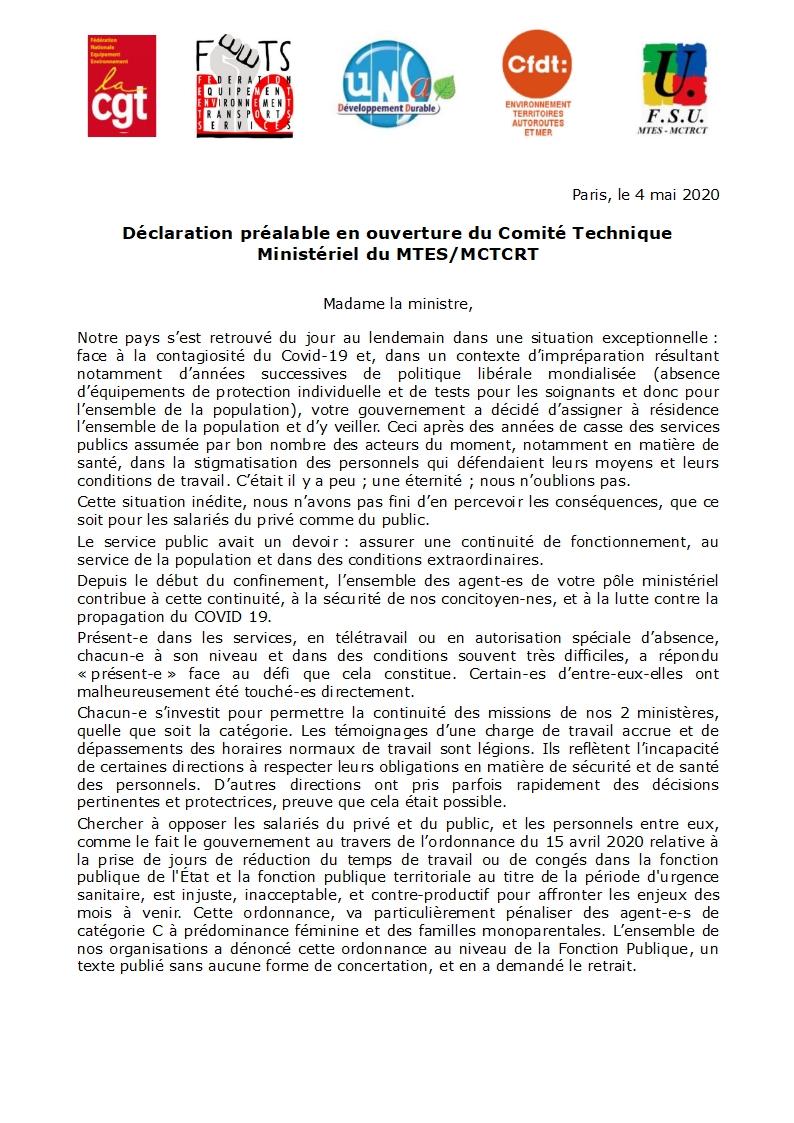 Coronavirus: déclaration unitaire à la ministre en ouverture du CTM exceptionnel du 5 mai 2020 Communiqué 4 mai 2020 Malvina Caubère Cliquez ICI