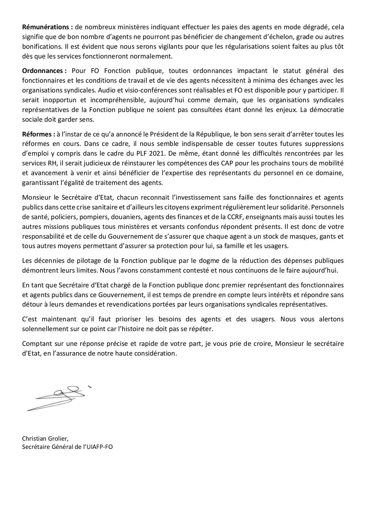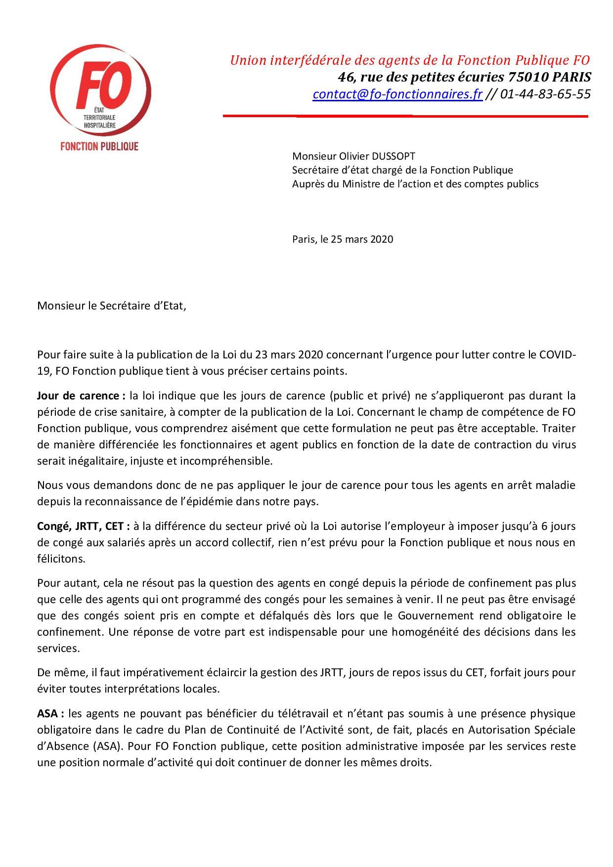 Coronavirus: RTT, CET, ASA, rémunérations FO écrit au secrétaire d’Etat chargé de la Fonction Publique