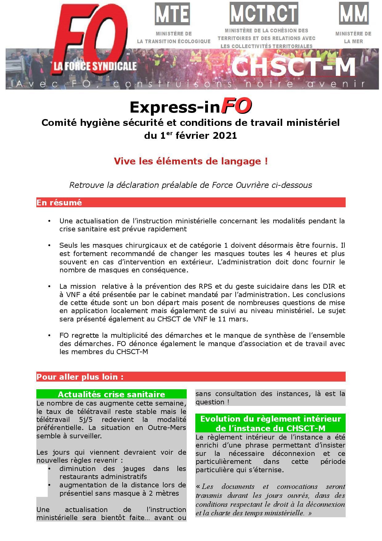 2 CHSCTM en une journée! Retrouvez ci-dessous les points saillants de la suite et fin du CHSCT-M entamé le 14 janvier, ainsi que du CHSCT-M du 1er février 2021.